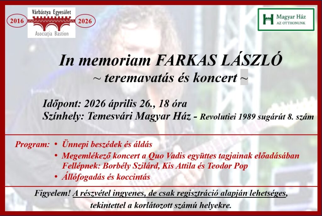 2026 április 26-án, vasárnap este 18 órától kerül sor a FARKAS LÁSZLÓ terem felavatására és a VÁRBÁSTYA EGYESÜLET ünnepi, évfordulós rendezvényére a Magyar Házban.